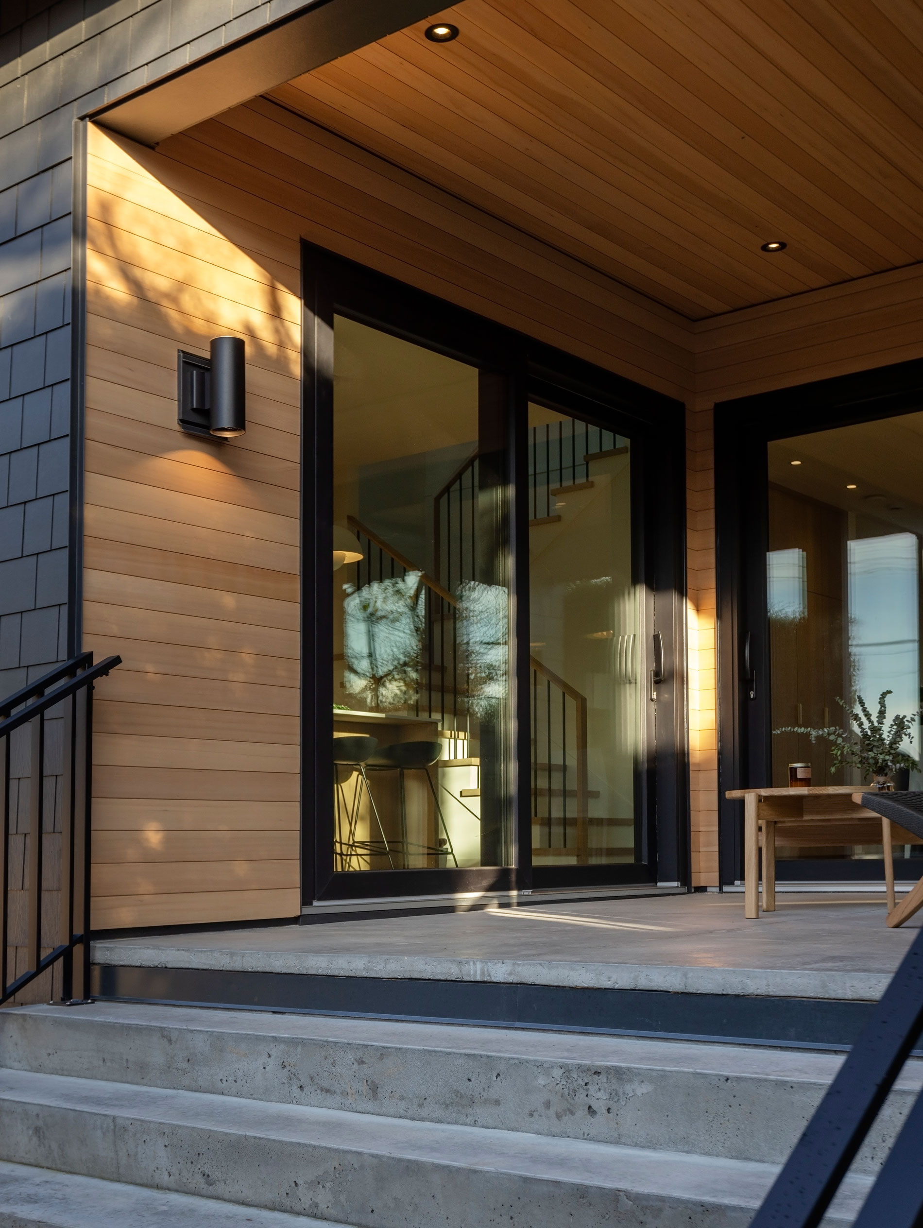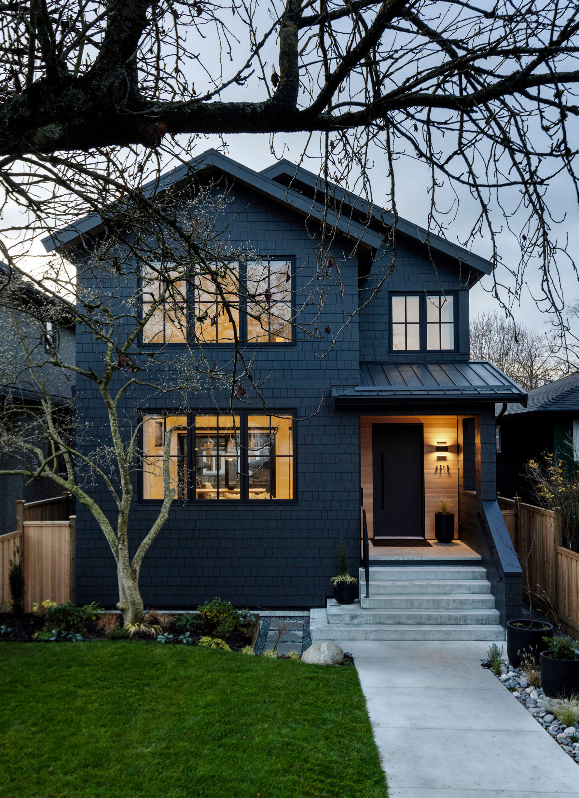 Its exterior features balanced rooflines, classic gables, and durable cladding, harmonizing with the neighbourhood and combining modern proportions with traditional forms for lasting curb appeal. Materials like Hardie siding, metal trim, and standing-seam metal roofing were chosen for durability and low maintenance, ideal for the coastal climate. Custom metal details and precise transitions highlight craftsmanship and quality.